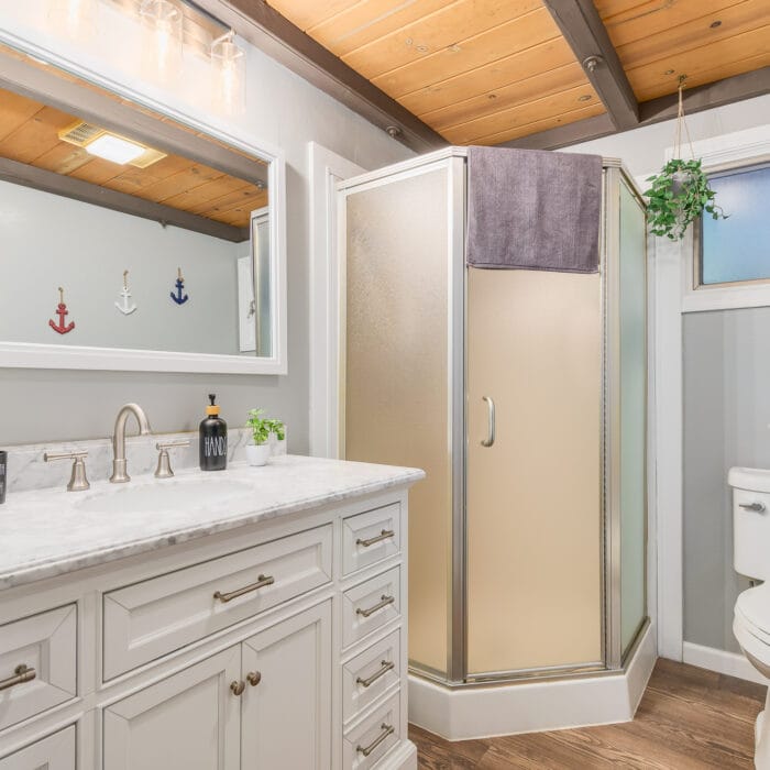 The master bedroom is a retreat in itself, offering a king-sized bed and an en-suite bathroom. The second bedroom includes a king-sized bed, and the third bedroom also has a king bed, perfect for children or extra guests. Each room is thoughtfully decorated and provides ample storage. The detached bunkhouse, which adds a fourth bedroom with two bunk beeds, offers flexible sleeping arrangements and includes its own full bath, making it perfect for kids or additional guests.